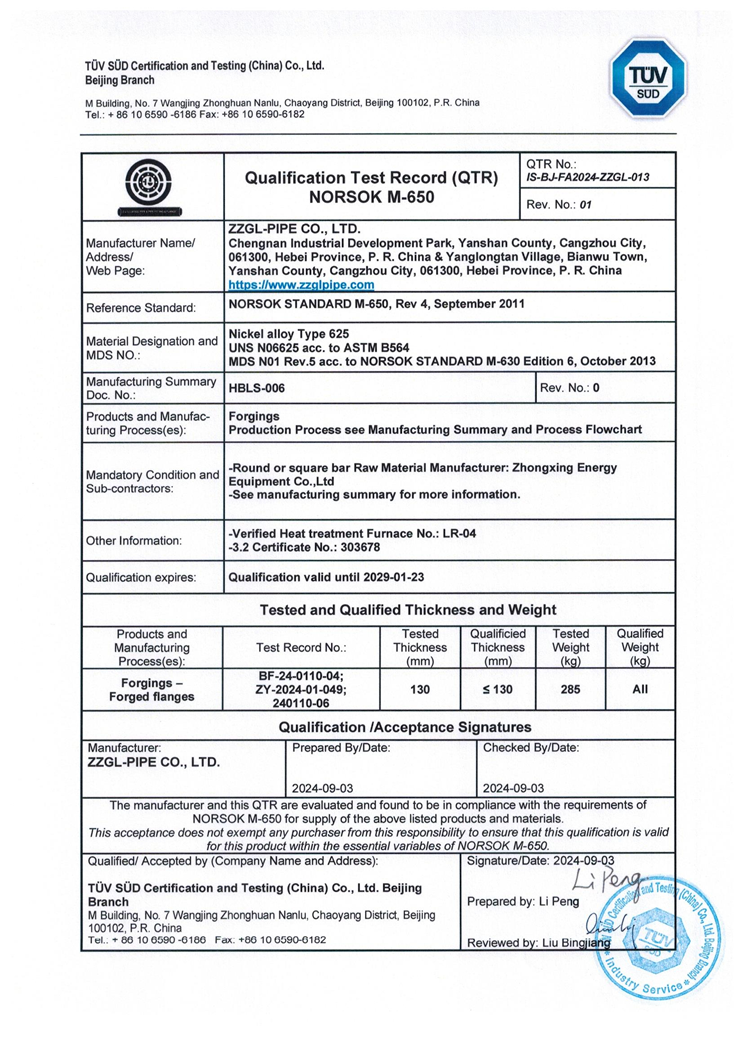 公司已通過挪威國家石油標(biāo)準(zhǔn)NORSOK M-650 ASTM B564 UNS N06625認(rèn)證。