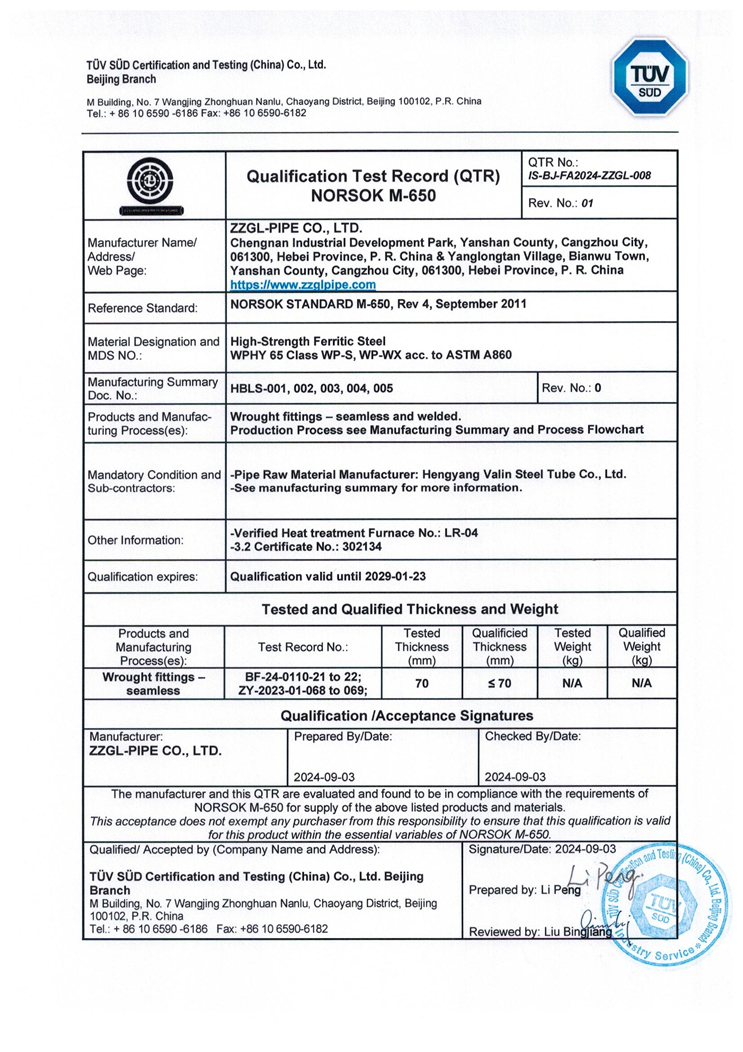 公司已通過挪威國家石油標(biāo)準(zhǔn)NORSOK M-650 ASTM A860 WPHY65認(rèn)證。